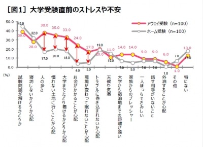 日または数日前にストレス・不安に感じたことを聞くと、両者とも「試験問題が解けるかどうか」(ホーム45.0%、アウェイ39.0%)を一番心配していますが、ホーム受験生は「寝坊しないかどうか」(32.0%)を2番目に心配したのに対し、アウェイ受験生は「人の多さ」(38.0%)や「慣れない土地に行くこと」(35.0%)、
