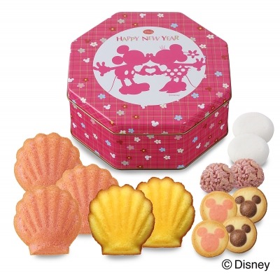 ふんわり焼き上げたマドレーヌや、ミッキーのシルエット柄がかわいいさくさくクッキーなどを詰め合わせた、新春限定ギフト缶です。リユースできるキュートな缶がうれしい!