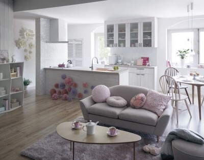 パステルカラーでカワイイだけでなく、ベージュカラーとホワイトカラーを合わせてスモーキーなピンク、パープルで甘く、渋く、ふわっとした印象に。ダイニング、ソファまわりのコーディネイトに比べ、リビングのシェルフはシンプルに。壁面とキッチン前パネルに付けたウォールフラワーをアイコンとして効果的に使っています。