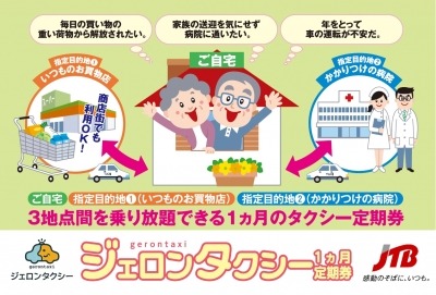 JTBジェロンタクシーは、自宅とかかりつけの病院、いつも買物する商店街やスーパーマーケットを指定目的地とする2地点をあらかじめ登録し、その間のタクシー移動を1ヵ月間定額乗り放題で利用できる定期券型のお出かけサポートサービスです。通常は乗車単位で支払うタクシー運賃を旅行業における募集型企画旅行商品で企画実施することにより1ヵ月の定期券として誕生した定額乗り放題商品となります。