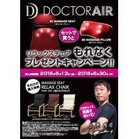 好評の豪華プレゼントキャンペーン!【リラックスチェアもれなくもらえるキャンペーン!】2016年5月13日(金)~2016年6月30日(木)まで、ドクターエア取扱店舗にて実施中