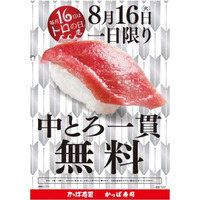 ~かっぱ寿司『毎月16日はトロ(16)の日』第5弾~「中とろ一貫」プレゼント!2016年8月16日(火)限定開催