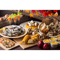 カクテルソースやわさびから小田原みかんジャムまでさまざまな付け合わせと楽しむオイスターバー。松茸ご飯、ポルチーニ茸のクリームパスタなどのきのこ料理をはじめ30種類以上が並ぶランチ