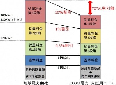 2016年4月に提供開始する「J:COM電力 家庭用コース」は、J:COMサービスエリア内の一戸建ておよび集合住宅各戸が対象です*5。ケーブル多チャンネル放送、高速インターネット、固定電話を含むJ:COMサービス(長期契約プラン)*6と組み合わせることで、地域電力会社に比べて電力量料金(従量部分)を3段階式で割り引いて提供します。割引率は、地域電力会社の従量電灯メニュー*7の第3段階料金部分(300kWhを超過する分*8)が10%、第2段階料金部分(120kWhをこえ300kWhまで*9)が1%、第1段階料金部分(最初の120kWhまで*10)が0.5%です。例えば関東の一戸建てにお住まいで月間電気使用量が485kWh、年間電気使用量が5,820kWhのご家庭が「J:COM電力 家庭用コース」にご加入いただいた場合、東京電力の電力料金(月額約12,600円)に比べて、年間で約6,800円お得になります*11。
