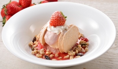 新登場、メレンゲの焼き菓子「ダコワーズ」に、苺クリーム、スパイス風味のゼリー、バニラアイス、グラノーラなどを盛り合わせました。