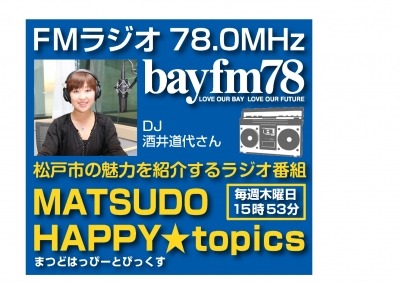 千葉県松戸市がお送りするラジオ番組「MATSUDO HAPPY☆topics(まつど はっぴー とぴっくす)」が、1月7日(木)からFMラジオ局「bayfm78(ベイエフエム)」でスタート!