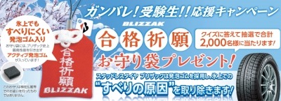 ブリヂストンタイヤジャパン株式会社は、受験生の皆様を応援するために2015年12月4日(金)より「BLIZZAK ガンバレ!受験生!!応援キャンペーン」を開催中です。特設キャンペーンサイト内のクイズに正解された方のうち、抽選で合計2,000名様に合格祈願お守り袋が当たります。BLIZZAKはおかげさまで全国装着率No.1※。全国の冬道ドライバーから最も支持されているスタッドレスタイヤです。