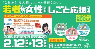 大阪市では、府内7信用金庫や大阪市私立保育園連盟、保育関連サービス企業などと連携し、平成28年2月12日(金曜日)から13日(土曜日)にかけて、OMMビル(大阪マーチャンダイズ・マートビル)において、「若者・女性等のしごと応援フェア」(以下「応援フェア」)を開催します。