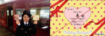 昨年12月に発売しご好評いただいたクリスマスデザインに続く「ハート型寿駅入場券」シリーズの第2弾となるこの入場券は、富士急行線に実在する縁起のいい駅名「寿駅」のきっぷ(入場券)を可愛らしいハート型の硬券にしたもので、バレンタインにちなみチョコレートをイメージした台紙には、大切な人へ“あま~い一言”を書き込むことができます。