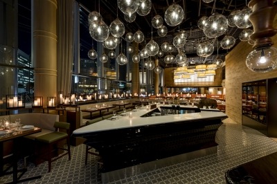 オン ア ターブルは、天井高7メートルの開放感溢れる店内に、煌びやかなシャンデリアが輝くラグジュアリーな雰囲気ながら、木の温もりを感じられるレストランです。