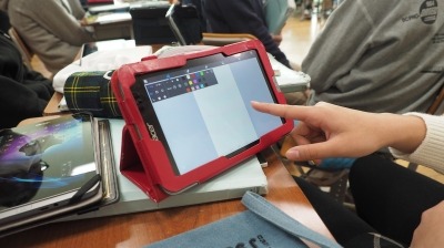 千葉大附属中では2014年度の新入生からタブレット端末を保護者負担で1人1台購入することとし、全普通教室に電子黒板機能付きプロジェクターと80インチのマグネットスクリーンを設置したほか、1学年フロアで無線LANも完備し、ICT教育の環境を整えてきました。2014年10月から1学年において1人1台のタブレット端末を活用した教育を開始。2015年度には生徒棟のすべて(全学年のフロア及び全特別教室)で無線LANを導入。2016年度の新入生が端末を購入することで、「全校生徒の1人1台タブレット端末活用」が実現します。