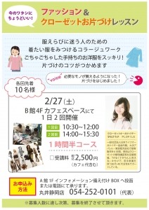 丸井静岡店(株式会社丸井、本社:東京都中野区、取締役社長:中村正雄)では、2月27日(土)に「今のワタシにちょうどいい! ファッション&クローゼットお片付けレッスン」を開催いたします。
