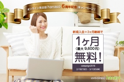 株式会社アンフープ(所在地:静岡県富士市、代表取締役社長:重森 渉)がサイト運営する、無料通話ソフトSkype(スカイプ)を利用したオンライン英会話スクール「hanaso」では、2016年2月16日(火) ~3月13日(日)に、期間中に新規入会の上3ヶ月継続でご利用いただくと、1ヶ月分の受講料(最大9,600円)が全額キャッシュバックとなります「6周年記念キャンペーン」を実施いたします。