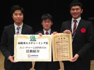 千葉大学環境ISO学生委員会から3名の代表者(千葉敦(園芸学部1年)、日隈壮一郎(工学部1年)、鷺谷駿(法政経学部1年))がプレゼンテーションを行い、見事、企業/団体賞「ユニ・チャーム最優秀エコチャーミング賞」を受賞しました。