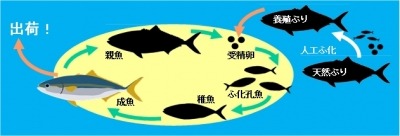 “完全養殖”とは、人工ふ化した魚を親として受精卵をとり、そこから次の世代を育てる、天然資源に依存しないサイクルを確立する養殖です。今回販売するぶりは、近畿大学の研究所で人口ふ化させた養殖ぶりの受精卵から孵った稚魚を、養殖場で約2年半かけて一般的に出荷するサイズ(5kg以上)になるまで育てたものです。