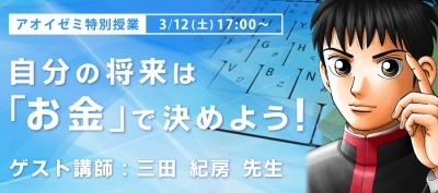 今回の特別授業では、「ドラゴン桜」にて大学受験教育を、現在連載中の「インベスターZ」ではお金・投資をテーマに取り上げてきたベストセラー漫画家・三田紀房先生をお招きして、中学生・高校生を対象に「お金から考える進路の授業」を講義します。中高生にとって身近ではないものの、将来を考える上で非常に大切なお金の話を聞いて、進路選択の視野を広げましょう。アオイゼミのライブ授業はストリーミング技術を用いた生放送で配信されます。通常時の授業と同じように、受講生はコメント機能を通して「その場で」講師に質問できるため、受講される際はぜひコメントをお送りください。