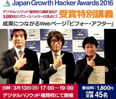 IT関連及びデジタルコンテンツの人材養成スクール、デジタルハリウッド福岡校は、Webページを改善して売上向上に貢献する全国のグロースハッカー3,000名の頂点を決める 「Japan Growth Hacker Awards 2016」において、全11部門のうち3部門を受賞した同校講師3名の「受賞特別講義」として、成果につながるWebページ「ビフォー・アフター」事例のトークイベントを開催します。