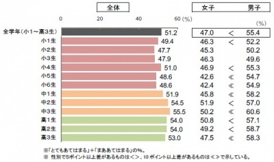 ●「夢中になって時間がたつのを忘れる」の経験率は7割前後。また、「うれしい思い」「くやしい思い」は5割前後が、「感動して泣く」は4割前後が経験している。ただし、いずれも女子の選択率のほうが高く、男子との差が大きい(小4~高3生全体で4~30ポイント差)。