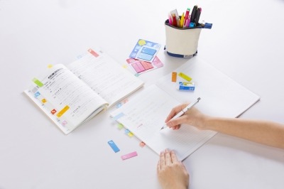 学生の方が勉強の際にふせんを使用する主な用途に合わせた文字デザインにしているので、無地のふせんに見出しを書き込む手間を省き、授業のスピードに合わせてすぐに使用することができます。また、透ける素材を使用しているためノートや参考書の邪魔になりません。