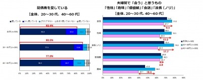 また夫婦間の「時間のあり方」でも世代差があり、20~30代の若い世代の方が「一緒にいる時間」や「会話時間」を「増やしたい」と考えていることがわかりました。(前者20~30代:37.0%、40~60代:16.3% 後者20~30代:42.5%、40~60代:19.3%)加えて「二人の時間を何よりも大事にしている」は20~30代が77.5%、40~60代が62.7%、また「配偶者の趣味などを尊重し、個人の時間を大切にしている」は20~30代が77.0%、40~60代が84.4%と、若い世代ほど「一緒にいる二人の時間」を大切に、世代が上がると配偶者を気遣いながら程良い距離で接していることがわかりました。