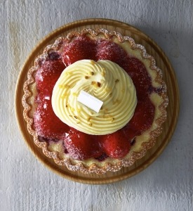 中心にはカスタードベースの生クリームをたっぷりと。ルタオが独自に開発したオリジナル生クリームを使っています。仕上げとして、春らしい苺とフランボワーズのソースをかけ、ピスタチオをちりばめて食感と風味のアクセントにしました。
