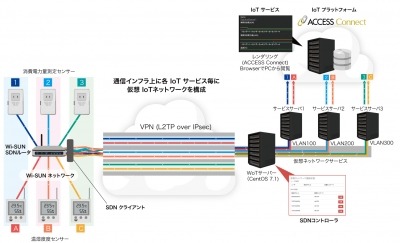 京都大学原田研究室とACCESSは、こうしたWi-SUNの優れた特性および日本における普及状況に着眼し、ACCESSのIoT技術とSDNネットワーク仮想化技術を統合することで、Wi-SUN機能が搭載された、多彩なセンサー・メーター・モニターといったIoT機器のための通信ネットワークを仮想化するソリューションを共同開発いたしました。本ソリューションを活用することで、電気・ガス、通信などインフラを有する事業者は、自社の同一インフラ上に、高いセキュリティ・運用性を担保しつつ、他の複数の IoTサービスを柔軟に追加で収容することが可能になります。