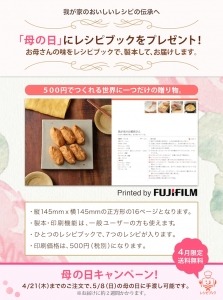 また、レシピブックを「母の日」の贈り物として活用して頂けるように、4月中のご注文に関しては、送料を「無料」とさせていただきます。お母さんの味をレシピブックで、製本して、お届けします。あなたにしかつくれない、世界で1冊のレシピブックで、お母さんに日頃の感謝を伝えてみませんか?