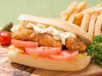 「フィッシュサンド」はサクサクに揚げた白身魚のフライ、キャベツなどの野菜のスパイシーソテー、スライストマトを歯ごたえのあるソフトフランスパンにはさみ、タルタルソースで仕上げました。(魚以外の食材は千葉県産以外のものも使用しています。魚の種類は入荷状況によって変わります)