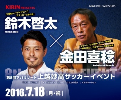 第8回「アパリゾート上越妙高サッカーイベント」は、「こどもふれあいサッカークリニック」「トーク&ディナーショー」「打ち上げ花火」「アパリゾート上越妙高イルミネーション」などイベント盛りだくさんで開催。第8回のゲストは、元サッカー日本代表で一般社団法人日本サッカー名蹴会会長 金田喜稔氏と元サッカー日本代表で、浦和レッドダイヤモンズ一筋16年、2015年シーズンをもって現役を引退した、鈴木啓太氏に決定。