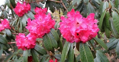 ヒマラヤに生育する高さ30mにもなる常緑樹。ヒマラヤでも人口密度の高い、標高1,000m~2,000mあたりに多く分布し、ネパール王国の国花になっています。花色は変異が多く、深紅色~淡紅色まで株によって様々です。当園に咲くものは、1959年(昭和34年)西北ネパール探検隊より種子を譲り受け、大切に育てている歴史ある植物です。現在見頃を迎え、4月下旬ごろまでお楽しみいただける見込みです。