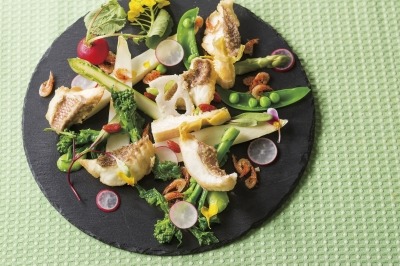 『大地と海』をテーマに、肥沃な大地で放し飼いされて育った希少な「比内地鶏」や、良質な餌が豊富な山口県萩漁港で獲れた魚など、こだわりの食材をイタリア料理のフルコースに仕立てます。萩漁港直送の魚は、その時獲れた魚からのインスピレーションで調理。地鶏の中でも最高峰といわれる比内地鶏は、ジューシーなモモ肉を“ロースト”と“フリカッセ(煮込み)”の2つの味わいでお楽しみいただけます。