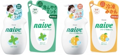 日本の夏は、気温が高いだけでなく湿度も高く、毎年、ひんやりとした爽快感を楽しめる商品に人気が集まります。「ナイーブ」は、独自の「サッパリクリア処方」でサッパリ気持ちよく家族の肌をやさしく洗い上げるボディソープです。今回、うるおい成分「ミントエキス」、「温州みかんエキス」に清涼成分「メントール」を加えることで、日本特有のジメジメと暑い夏にぴったりの、ひんやり感が高くすっきりとした洗い心地を実現しました。“冷んやり素肌”に導く「冷んやりミント」と“ひんやりさらさら素肌”に導く「冷凍みかん」が、肌を“サッパリ
