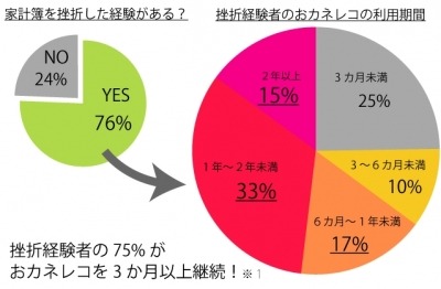 当社実施のアンケート(※1 期間:2016年2月25日~3月28日、有効回答数:2,590件、調査対象:おカネレコユーザー、調査手法: WEBアンケート調査)によると、89.5%が半年以上「おカネレコ」を継続していると回答しました。また過去に家計簿を挫折した経験では76%が挫折経験ありとなりました。挫折経験のあるユーザーのうち75%が「おカネレコ」は3か月以上継続していると回答しました。また、アプリに対する満足度の設問では91.1%が満足していると回答しており、50%以上のユーザーが一番満足な点として「入力のしやすさ」をあげています。