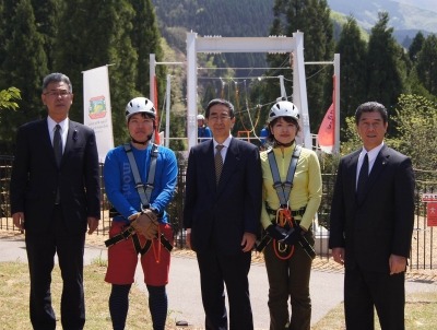 開業前日の4月26日(火)には、「Tree Picnic Adventure IKEDA」の開業式を開催しました。登壇した福井県知事 西川一誠氏は「待ちに待った開業式を無事迎えることができて非常に嬉しい。町の経済発展や都市部との交流、そして雇用の創出につながることを期待している。また、明日から一般オープンするにあたり、この施設を通じて山や木をもっと身近に感じてもらうことで、町民にとって誇れる施設づくりを目指して欲しい。」とコメントしました。池田町長 杉本博文氏は「顔の見えるコミュニケーション経済の促進を目指し、“森の営み・自然の匠・人の技”で観光だけでなく、雇用の促進や地域交流に繋げられることができれば、町の活性にも繋がる。」と意気込みをコメントしました。また、開業式では、メガジップライン初飛行式も行われ、福井県知事・池田町長・池田町議会議長の号砲とともに北海道からIターンした松本さんとUターンの北川さんが晴天に恵まれた池田町の空を滑空しました。