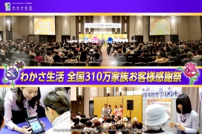 株式会社わかさ生活は、『ブルーベリーアイ』をはじめとした商品をご愛飲いただいている全国310万家族のお客様に日頃の感謝の気持ちを伝えるため、『全国310万家族 お客様感謝祭』を2016年5月9日(月)の大阪会場をスタートとして全国主要都市にて順次開催いたします。本日の会場となったヒルトン大阪には約500名ものお客様がご来場いただき、社長・角谷建耀知からのメッセージや健康講座、音楽コンサートなど大盛況でスタートしました。
