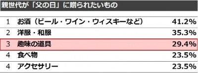 「父の日に子供から贈られたいものは?」と聞いた質問では、「趣味の道具」が3位に