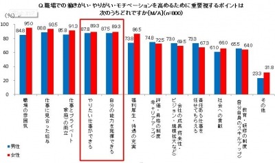 実際に、職場での働きがい・やりがい・モチベーションを高めるために重視するポイントを見てみると、女性の回答として「職場の雰囲気(95%)」「仕事とプライベート(家庭)の両立(91.3%)」など、働きやすさに関する項目が高い結果となりました。またそのほかにも、「仕事に見合った給与(93.5%)」「やりたい仕事ができる(89.3%)」「自分の能力を発揮できる(89.3%)」など、仕事内容やその評価に関する項目でも、男性よりも女性の方がより重視していることがわかります。