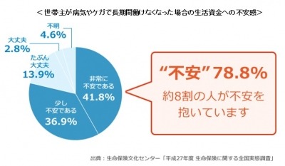 生命保険文化センターの「平成27年度 生命保険に関する全国実態調査」では、「世帯主が就労不能となった場合の生活資金」について、「非常に不安」が4割(41.8%)、「少し不安」が3割半(36.9%)と、約8割(78.8%)近い人が不安を抱えていることがわかりました。