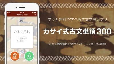 無料で学べるスマホ学習塾「アオイゼミ」を運営する株式会社葵(本社:東京都新宿区、代表取締役:石井 貴基)は、アオイゼミや代々木ゼミナールなどで活躍する古文講師・葛西 佑也先生監修のもと開発したiOS用スマートフォンアプリ「カサイ式古文単語300」の配信を開始しましたことをお知らせします。