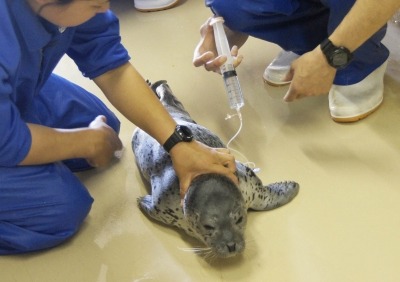 保護したゴマフアザラシはオスの幼獣で、今年の春にオホーツク海の流氷上で誕生した赤ちゃんが何らかの理由で一宮海水浴場に流れつき上陸したと考えられ、幼獣であることと体が痩せて衰弱が激しいという判断から、保護を決定し当館に搬入しました。保護当時の体長は70cm、体重は9.4kgで、外傷は見られなかったものの衰弱が激しく、脱水症状が考えられたため、皮下への注射器による補液を行いました。現在は自分でエサの魚を食べ始め、快方に向かっています。