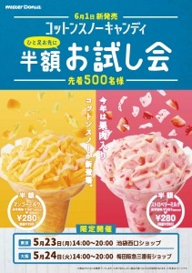 6月1日(水)から発売する『コットンスノーキャンディ』の発売に先駆け、東京と大阪のミスタードーナツ2店舗限定で「コットンスノーキャンディ半額お試し会」を開催します。