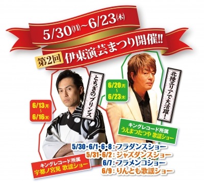 伊東演芸まつりは、大好評をいただいた昨年に続き今回2回目の開催。目玉は、大江戸温泉物語グループの北陸エリアで活躍している「うえまつたつや」(キングレコード所属)と、同グループのホテルニュー塩原で人気の栃木のプリンス「宇都ノ宮晃」(同)が歌謡ショーで魅力あふれる歌声と軽快なトークを披露します。また、フラダンスショーやジャズダンスショーも開催いたします。