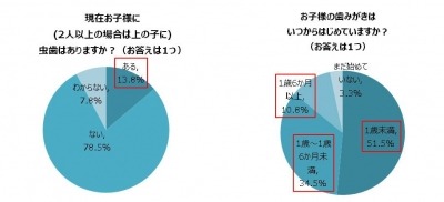 ◆歯磨きは歯の生え始めてきた1歳未満から始める割合が半数を超え、1歳代でほとんどのお子様が歯磨きを始めている。むし歯対策の取り組みの1位は1日1回以上の歯磨きで、85%以上が取り組んでいると回答。
