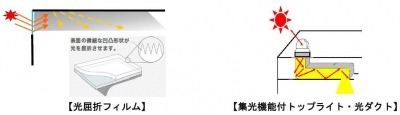 また、太陽光を集光できる機能を持った「集光機能付トップライト」や、天窓から取り込んだ太陽光をアルミ鏡面のダクトで反射させ、建物内部に自然光を届けることができる「光ダクト」を設けることで、照明電力を30%以上削減します。