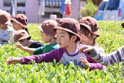 園舎裏の茶畑にて行われた1日目の「お茶摘み」では、子どもたちがそれぞれ茶摘みの籠を持って出かけていきました。「一芯三葉」を丁寧に数えながら、上から3つ目の柔らかい葉を摘んでいく子どもたちの眼差しは真剣そのもの。たくさん取れたか気になる園児の様子も見受けられました。