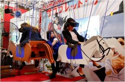VRヘッドセットを着用して馬型のブランコに乗り、レースを体験する飛行型4D競馬アトラクション。