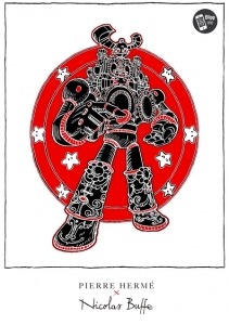 PIERRE HERMÉ PARIS は今年2016年Nicolas Buffe*(ニコラ・ビュフ)と様々なアートコラボレーションを繰り広げており、彼の手掛けるストーリーに登場するマカロンをこよなく愛するの心優しいスーパーロボット「Athanor 3 アタノール3号」を、アンバサダーに任命し『マカロンデー』のそれぞれの人にとって愛着の湧く、価値ある一日にしていきます。スーパーロボット「アタノール3号」のギフトボックスやフライヤーをBlipp/ブリップ(注1)すると、3Dアニメーション化されたスーパーロボットが出現し、チャリティーについての詳細や、今年の『マカロンデー』を盛り上げる様々なコンテンツが紹介されています。