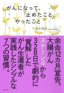 著者の野中秀訓氏は、起業したばかりの会社が軌道に乗り始めた2014年に大腸がんが発覚。「ステージ4」「余命1年」の宣告を受けた後、「どうしたらがんが治るか」について手探りで情報収集し、様々な治療法を模索。その中から「自分がいいと思うもの」は即座に実践し、1年後に事実上の寛解にたどり着くまでの軌跡を、本書は本人の心境を交えて記しています。