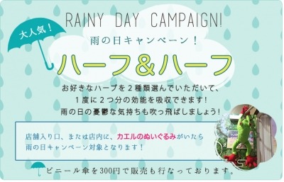 1度に2つ分の効能を吸収して雨の日の憂鬱な気分も吹っ飛ばしましょう!サロン入り口、またはサロン内にカエルのぬいぐるみが出ていたら雨の日キャンペーンの対象日となります。
