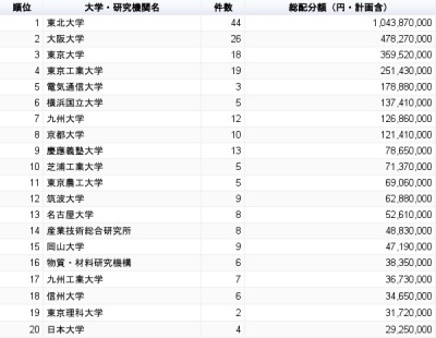 総投資額約40億円、全大学/研究機機関102、373テーマ中、「157. 人工筋肉/ソフトアクチュエータ」市場における大学・研究機関別(※2)の科研費獲得金額ランキングTOP50(※3)